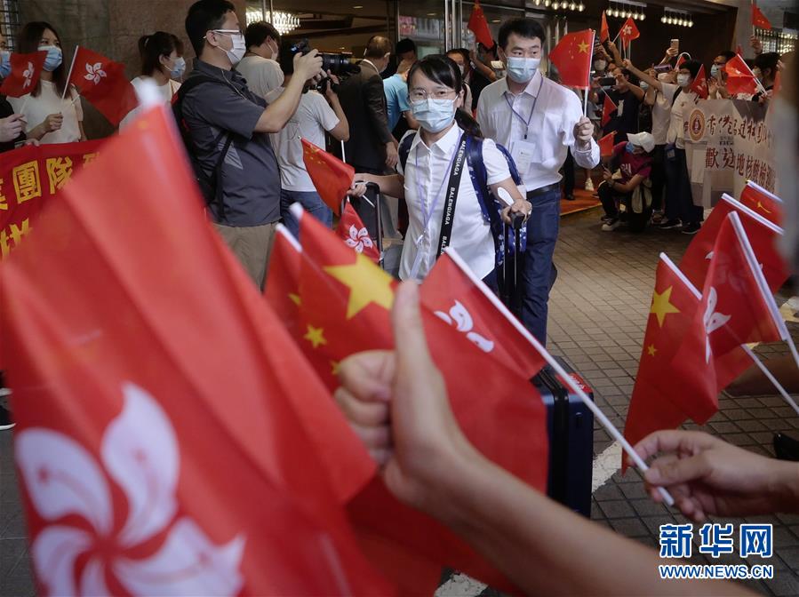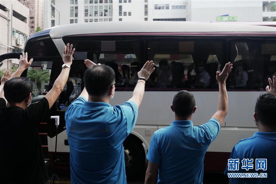 支援隊按廣西、福建、廣東三個來源地分批乘車。7時許,幾十名支援隊員排成一隊,整齊有序走出酒店,走向等候在酒店門口馬路上的跨境大巴。從酒店大堂一直到大巴,等候多時的市民們夾道歡送,他們鼓掌、招手,揮舞手中的國旗、區旗和標語牌,朝隊員們深情致謝:「謝謝你們!」「一路平安!」……