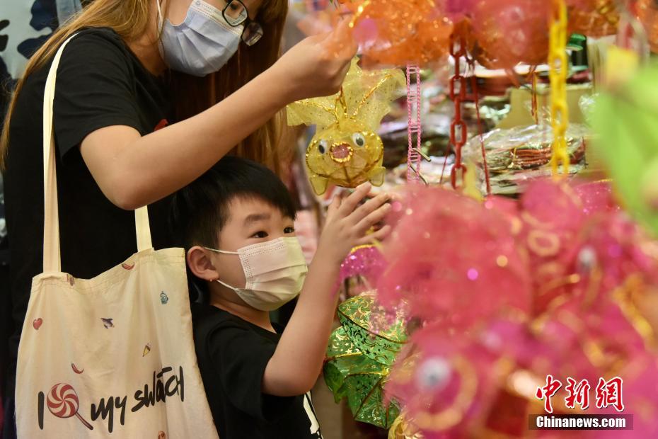 9月27日,家長帶同小朋友入內感受傳統手工藝文化。中秋節即將到來,位於香港元朗大橋街市的香燭小店佈置成「燈籠街」,挂起數百個傳統紙扎燈籠,吸引大量市民入內選購。(中新社記者 李志華 攝)