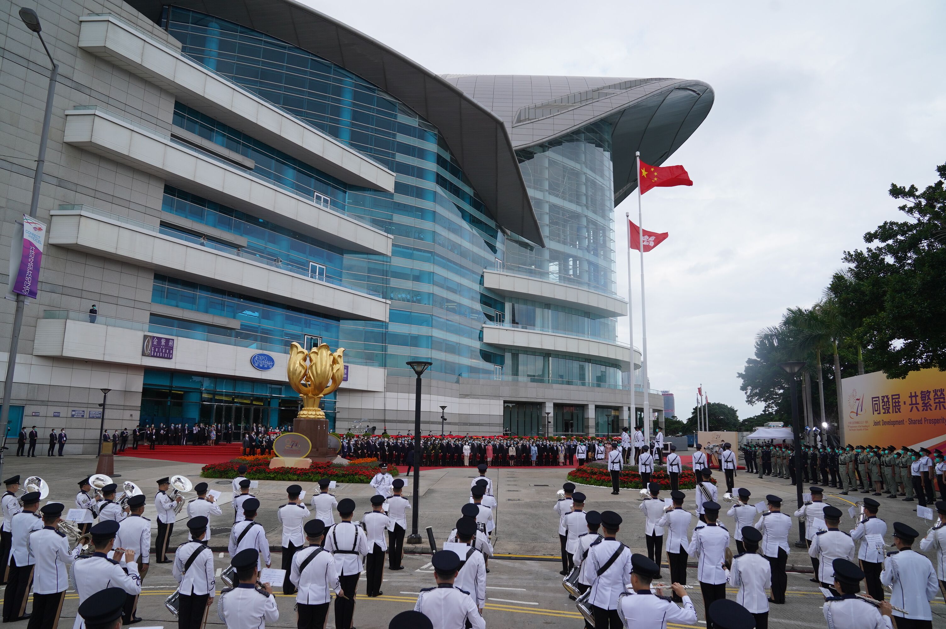 香港警察銀樂隊奏起樂曲,儀仗隊和護旗隊邁步進入金紫荊廣場。在莊嚴的國歌聲中,鮮艷的國旗和香港特區區旗冉冉升起。懸挂着國旗和區旗的特區政府飛行服務隊直升機飛過維多利亞港上空,消防處滅火輪噴灑着水花駛過維港水面。