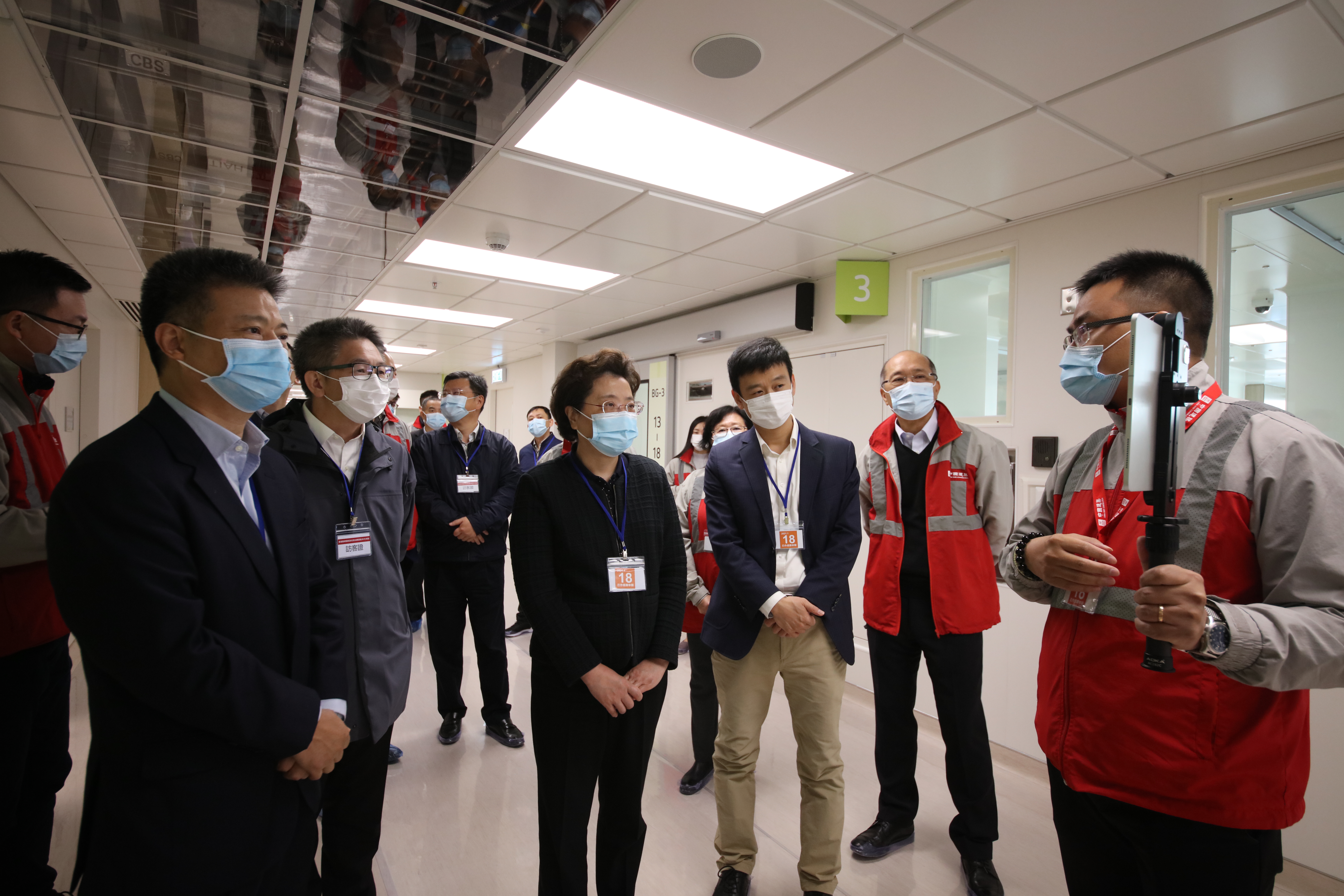 仇鴻副主任參觀醫院內部隔離病房及配套設施。(圖片來源:中央政府駐港聯絡辦)