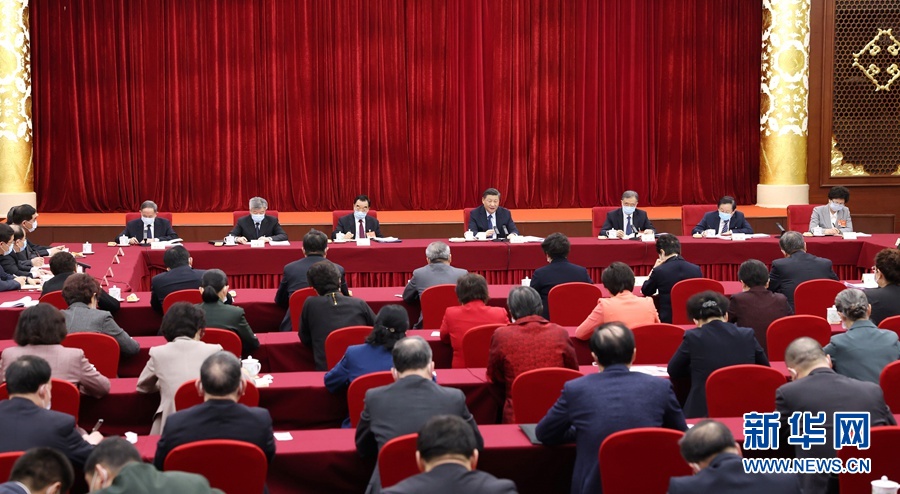3月6日,中共中央總書記、國家主席、中央軍委主席習近平看望參加全國政協十三屆四次會議的醫藥衞生界、教育界委員,並參加聯組會,聽取意見和建議。中共中央政治局常委、全國政協主席汪洋參加看望和討論。(新華社記者 鞠鵬 攝)
