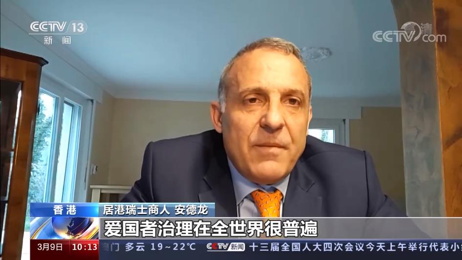 居港瑞士商人 安德龍:愛國者治理在全世界很普遍,沒有任何國家會允許不愛國的人加入管治隊伍,完善選舉制度會讓香港受益,讓社會秩序更加穩定。「兩制」的前提是「一國」,捍衛國家主權是最重要的。