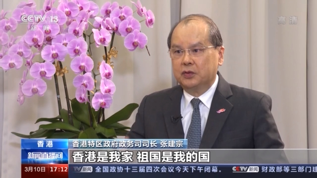 香港特區政府政務司司長 張建宗:香港是我家,祖國是我的國,我愛國同時愛港,愛國愛港是應有之義,是理所當然。「愛國者治港」是全面準確貫徹「一國兩制」的落實,實踐最基本的條件,同時就是要維護國家的主權、安全,讓香港向前邁進,長治久安。