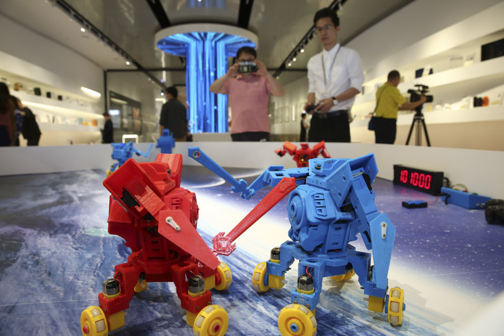 在廣東工業設計城創新科技館,工作人員在展示機器人「速鬥無人區」(4月19日攝)。(新華社記者 殷剛 攝)