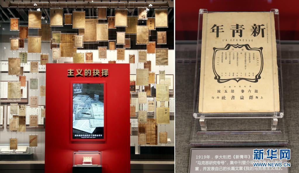 大型立體式視覺置景名為「主義的抉擇」,100件五四運動前後傳播馬克思主義、社會主義的報紙雜誌,錯落陳列在玻璃墻上。其中,《新青年》第6卷第5號「馬克思研究專號」在前端「高光」展示,這期「專號」標誌着馬克思主義在中國的傳播進入了較為系統的階段(6月1日攝)。(新華社記者 劉穎 攝)