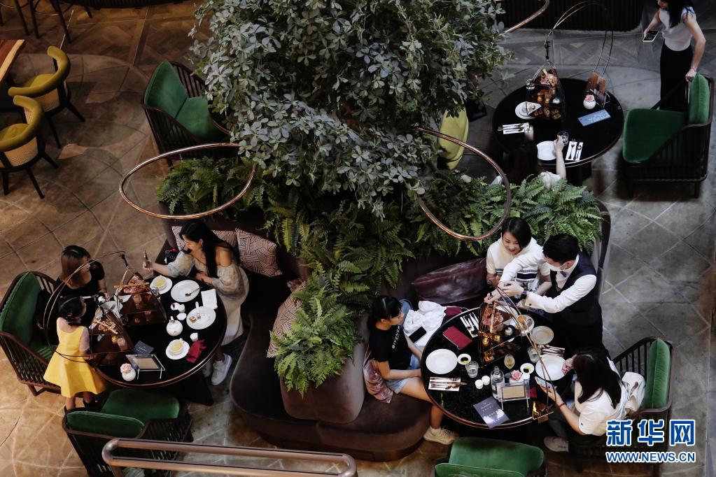 7月7日,市民在香港尖沙咀一家商場的咖啡廳享受休閒生活。(新華社記者 王申 攝)
