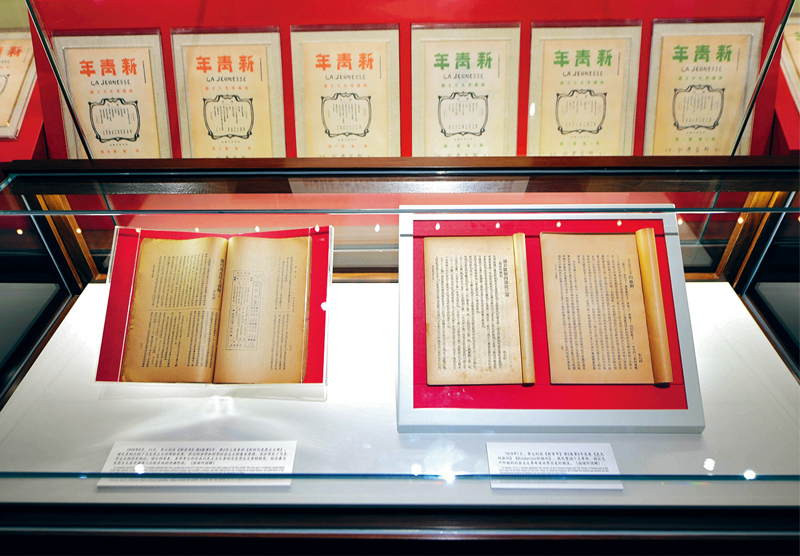 中國共産黨為什麼能,中國特色社會主義為什麼好,歸根到底是因為馬克思主義行。圖為2021年6月26日在北大紅樓拍攝的刊登李大釗《布爾什維主義的勝利》、《我的馬克思主義觀》的《新青年》5卷5號(右)、6卷5號(左)原件。(新華社記者 謝晗/攝)