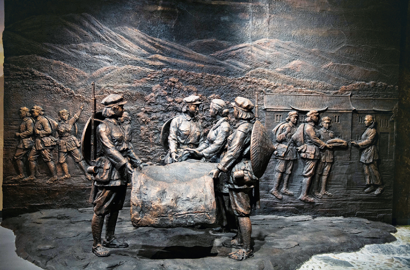 「半條被子」的故事充分體現了中國共産黨的人民情懷和為民本質。圖為在湖南省郴州市汝城縣沙洲瑤族村「半條被子的溫暖」專題陳列館拍攝的「半條被子」故事雕塑。(新華社記者 陳思汗/攝)