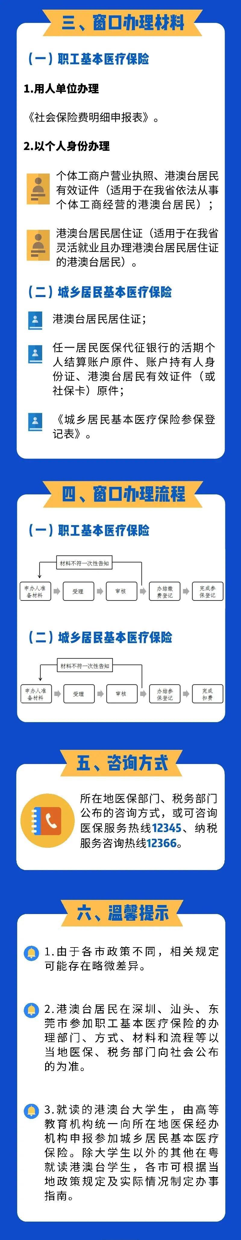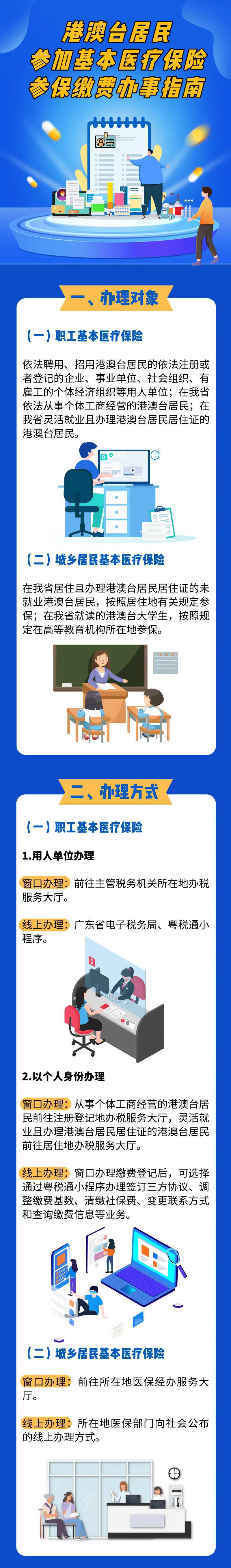 廣東省醫療保障局聯合廣東省稅務局日前印發《香港澳門台灣居民參加基本醫療保險參保繳費辦事指南》(以下簡稱《辦事指南》),以便更好促進在廣東省學習、就業、生活的港澳台居民參加基本醫療保險。