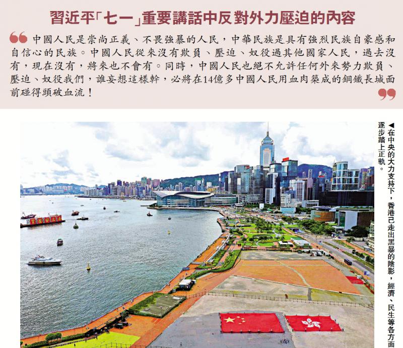 以美國為首的外國反華勢力近年頻頻干預香港的內部事務,甚至無理制裁中央政府及特區政府官員。中共中央總書記、國家主席、中央軍委主席習近平,在慶祝中國共産黨成立100周年大會上發表重要講話,強調中國人民絕不允許任何外來勢力欺負、壓迫、奴役我們,誰妄想這樣幹,必將在14億多中國人民用血肉築成的鋼鐵長城面前碰得頭破血流。