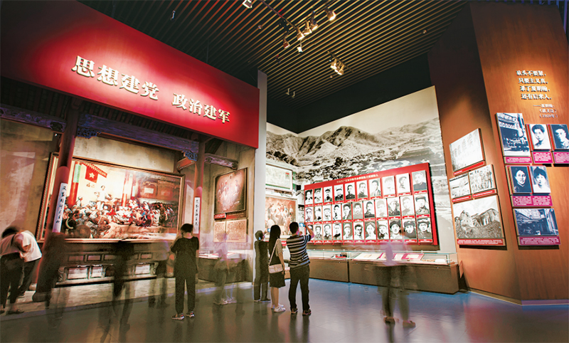 1929年12月,中共紅四軍第九次代表大會在福建上杭古田召開,古田會議確立了思想建黨、政治建軍的根本原則。圖為2021年7月19日,在參觀中國共産黨歷史展覽館舉行的「『不忘初心、牢記使命』中國共産黨歷史展覽」時,觀眾在油畫《古田會議》前駐足。(劉新武/攝)