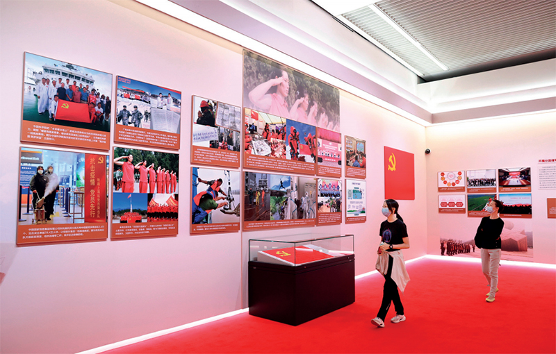 為慶祝中國共産黨成立100周年,2021年7月8日,「讓黨中央放心、讓人民群眾滿意——新時代中央和國家機關黨的建設成就巡禮展」在國家博物館開幕。展覽以貫徹落實習近平總書記在中央和國家機關黨的建設工作會議上的重要講話精神為主線,通過2700余幅圖片、185件實物、3000余冊圖書,生動展現了黨的十八大以來中央和國家機關黨建取得的顯著成績和深刻變化。圖為7月11日,觀眾在該展覽參觀。(中新社發 陳曉根/攝)