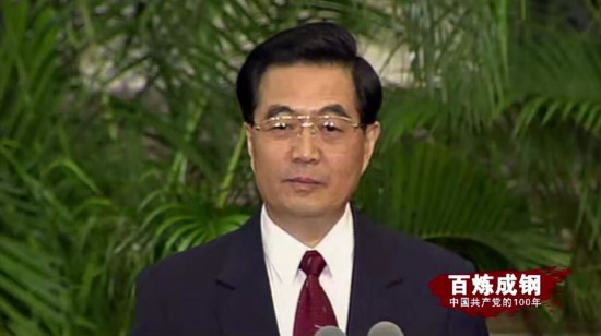 胡錦濤説:「我們一定不辜負全黨同志的重托和全國人民的期望,高舉鄧小平理論偉大旗幟,全面貫徹「三個代表」重要思想,認真落實十六大提出的各項任務,緊密團結和依靠全黨、全國各族人民,繼往開來,與時俱進,為全面建設小康社會,加快推進社會主義現代化,開創中國特色社會主義事業的新局面而努力奮鬥!」