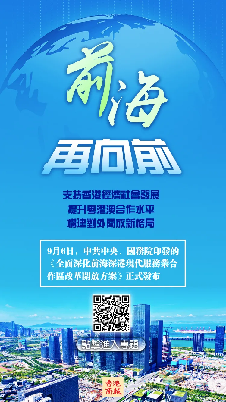 中共中央、國務院9月6日發布《全面深化前海深港現代服務業合作區改革開放方案》,前海合作區將打造粵港澳大灣區全面深化改革創新試驗平台,建設高水平對外開放門戶樞紐。這是國家戰略在粵港澳大灣區的又一體現,是豐富「一國兩制」實踐,深化改革、擴大開放,提升港深合作水平的重大部署。對香港而言,前海深港合作區進入發展新階段,既是對香港未來與深圳、大灣區合作發展提出新使命,亦給香港帶來新發展空間,各界要把握前海方案的新機遇,推動更高水平的融合發展,共創美好大未來。