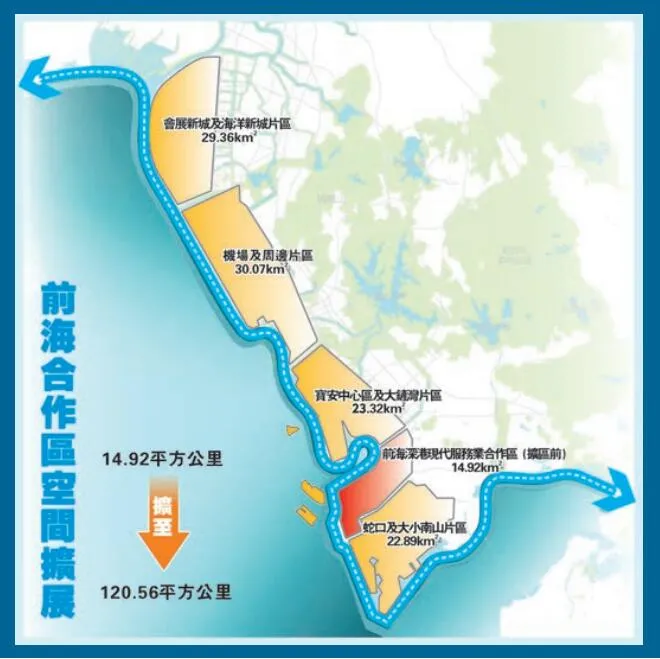 方案明確,進一步擴展前海合作區發展空間,前海合作區總面積由14.92平方公里擴展至120.56平方公里,是之前的8倍。