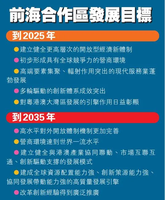 《前海方案》指出,到2035年,高水平對外開放體制機制更加完善,營商環境達到世界一流水平,建立健全與港澳産業協同聯動、市場互聯互通、創新驅動支撐的發展模式,建成全球資源配置能力強、創新策源能力強、協同發展帶動能力強的高質量發展引擎,改革創新經驗得到廣泛推廣。方案包括5個部分14條內容。