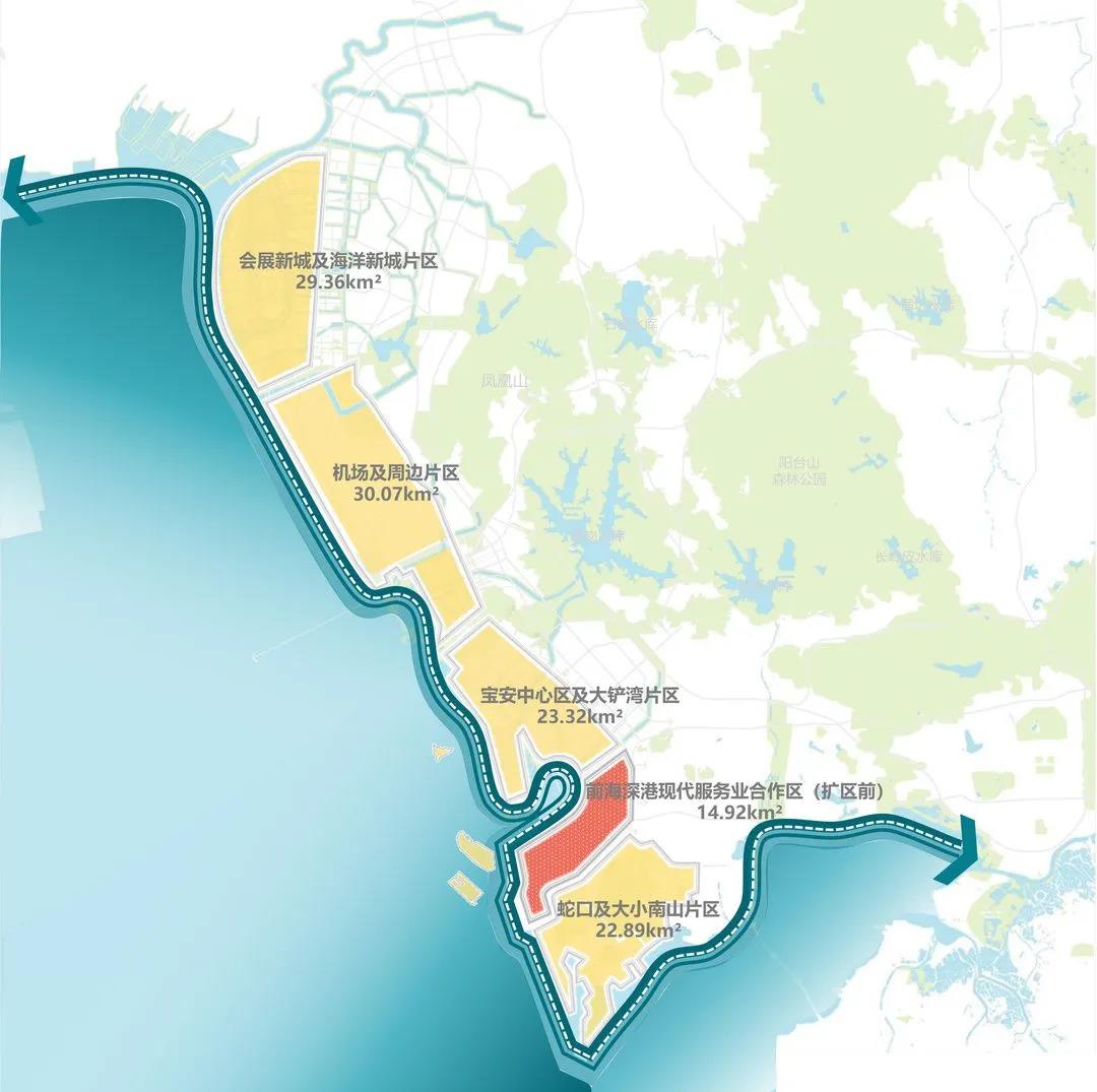一個更大的發展空間,展現眼前。《方案》明確了新的前海合作區實施範圍,以現有前海合作區為基礎,進一步擴展至南側毗鄰的蛇口及大小南山、北側毗鄰的會展新城及海洋新城、機場及周邊地區、寶安中心區及大鏟灣等片區,總面積由14.92平方公里擴展到 120.56 平方公里,為原來面積的8倍。