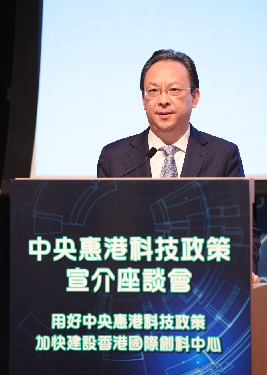 薛永恒在致辭中感謝中央政府一直以來對香港創科的大力支持。他表示,香港一定抓住機遇,積極融入粵港澳大灣區,推動香港創科發展各方面要素流通,全力推動粵港澳大灣區國際科技創新中心建設。