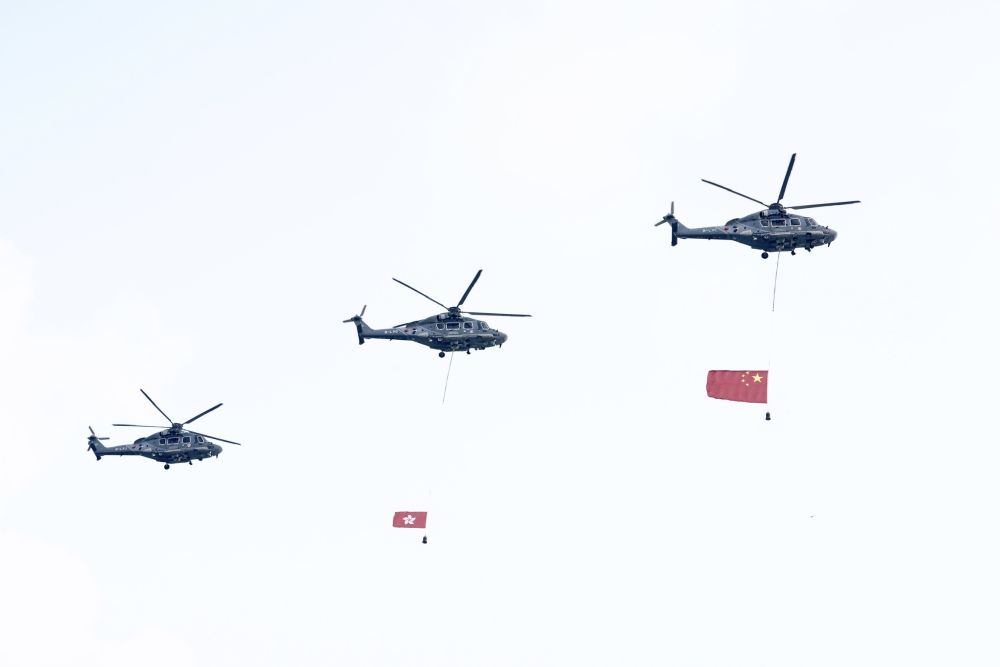 儀式開始後,在香港警察銀樂隊的奏樂中,儀仗隊和護旗隊邁步進入金紫荊廣場。莊嚴的國歌奏響,鮮艷的中華人民共和國國旗和香港特區區旗冉冉升起。懸挂着國旗和區旗的特區政府飛行服務隊直升機飛過維多利亞港上空,消防處滅火輪噴灑着水花駛過維港水面。
