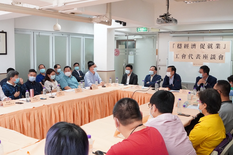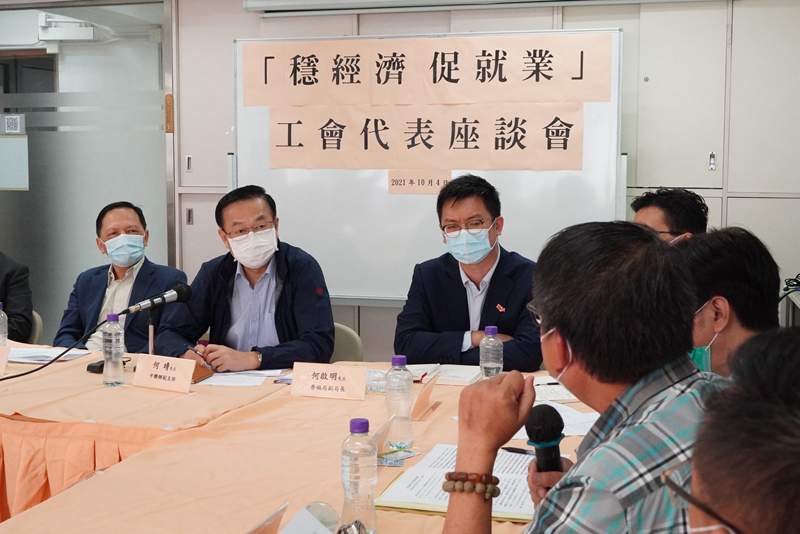 工聯會職訓委主任陳鄧源説,香港過去兩年經歷「黑暴」和疫情衝擊,航空、旅遊等行業最受影響,很多工友失業、停薪留職、被迫放無薪假。特區政府之前表示要創造6萬個臨時職位,但現時只有4萬個,仍有2萬多個缺口。海員工會梁耀全反映,港澳船員工由2019年初的1200人減至目前僅有300人,即使留職亦要減薪30%或長期放無薪假。日語導游唐寧指出,旅遊業全面癱瘓將近兩年,大部分從業員已經轉行,希望政府增設郊野公園、傳統文化宣講員等臨時職位。酒店房務員麥淑琼提到,隨着疫情平緩,酒店行業已逐漸恢復,從業員工作量大增,但收入沒有得到相應提升。服務業工人譚慧華激動地説,自由工作者的欠薪和歧視問題時有發生,建議政府保障最低強積金供款額,要求雇傭雙方簽訂合約。運輸業工人曾憲傑反映,超過2000名跨境司機每日往返兩地,但在香港沒有休息地方,有的只能在車上過夜,嚴重影響司機狀態。座談交流中,還有工會代表指現時失業人數18萬,但勞工處有6萬個職位空缺,存在「有工無人做、有人無工做」的錯配現象。有製造業工人更指已失業多時,平日只靠「炒散」當小販,每日賺取一二百元不夠養家。有搭棚工人亦抱怨保險費用過高「買不起」,人身安全得不到保障。