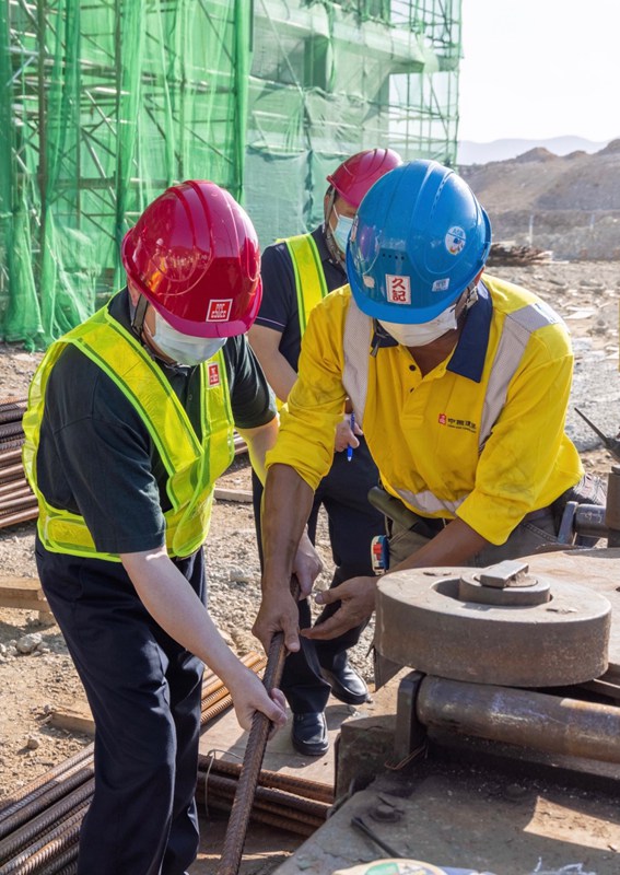 譚鐵牛還請阿林現場示範扎鐵,體驗扎鐵流程,檢視工友手套和頭盔的安全性、舒適性,叮囑他們要時刻注意安全。