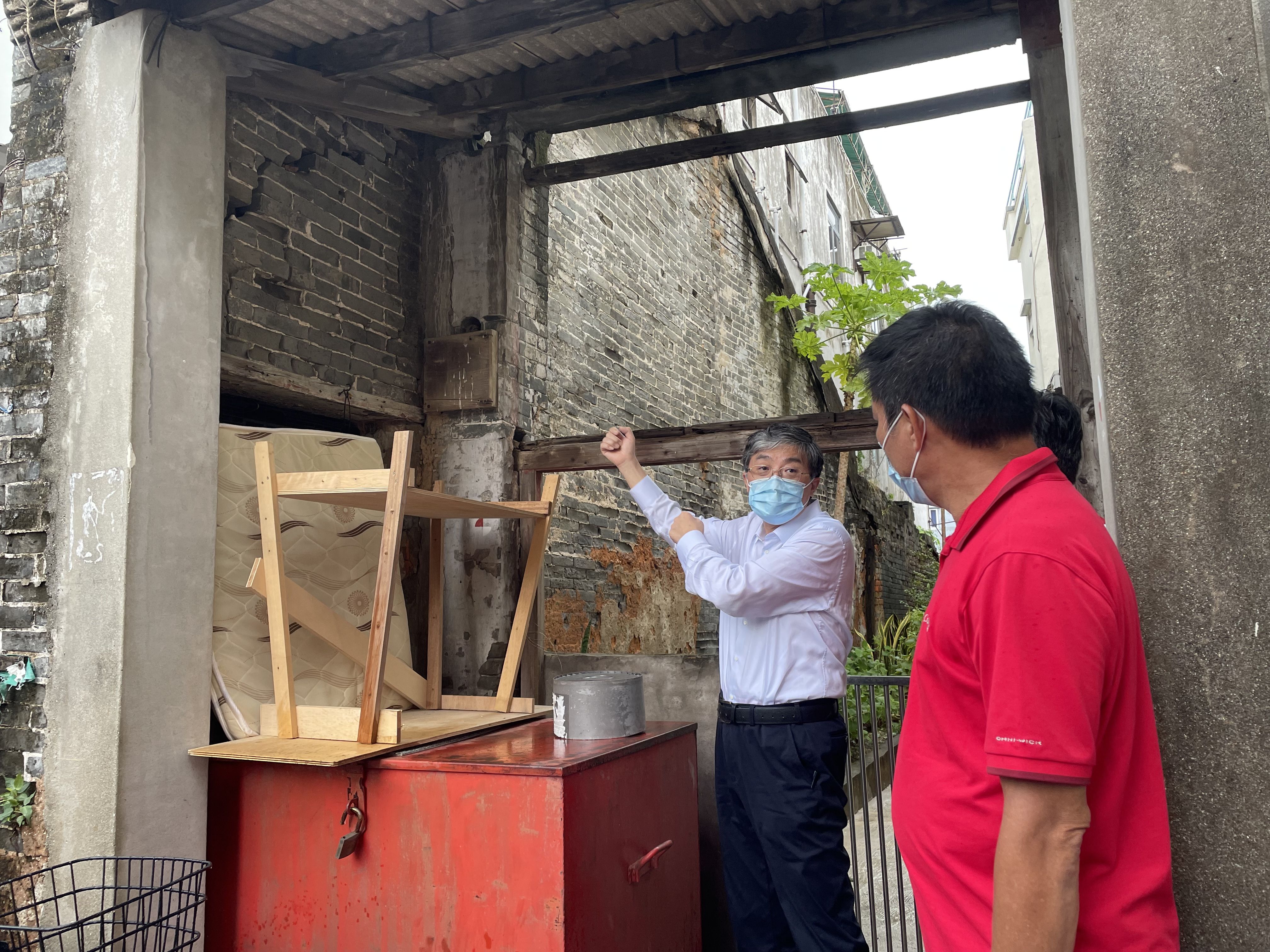 在大澳老街走訪時,突降暴雨,隨處可見的積水和堆放在路旁的廢棄建築材料,引起了羅永綱對幾處房體傾斜、墻壁開裂舊房子的關注。村民們説,這些房子常年無人居住、年久失修,很有可能倒塌。他一再叮囑,這太不安全了,要盡快拉上警戒線,挂上警示牌,採取防護措施,以免傷及行人。