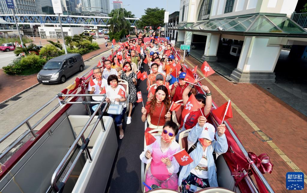 10月1日,在香港街頭,參加慶祝國慶巴士巡游的人們揮動國旗和香港特區區旗。(新華社記者 盧炳輝 攝)