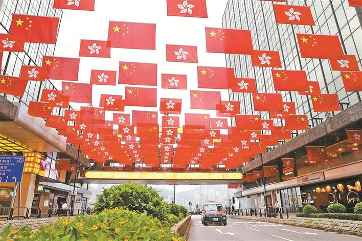 在香港尖沙咀一條街上,中華人民共和國國旗和香港特別行政區區旗一起迎風飄揚。(新華社發)