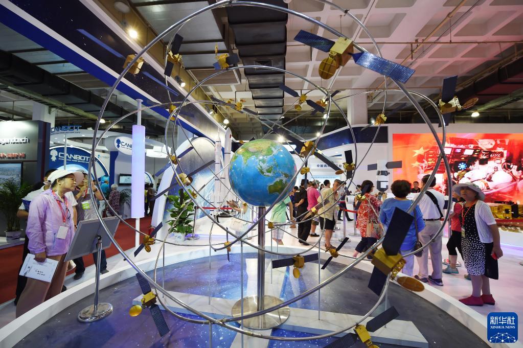 參觀者在第二十屆中國北京國際科技産業博覽會上參觀展出的北斗衛星導航系統模型(2017年6月9日攝)。(新華社記者 鞠煥宗 攝)