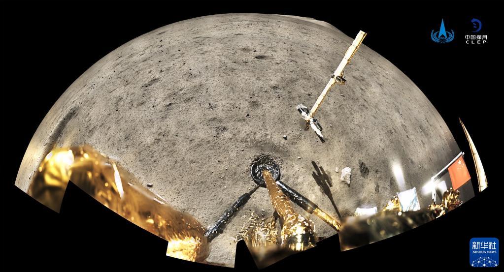 2020年12月4日,國家航天局公布了探月工程嫦娥五號探測器在月球表面國旗展示的照片。嫦娥五號着陸器和上升器組合體全景相機環拍成像,五星紅旗在月面成功展開,此外圖像上方可見已完成表取採樣的機械臂及採樣器。新華社發(國家航天局供圖)
