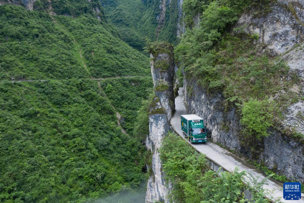 郵車行進在通往四川省漢源縣永利鄉古路村的山路上(6月23日攝,無人機照片)。(新華社記者 江宏景 攝)
