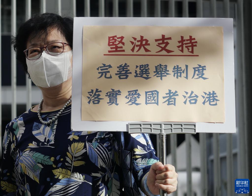 5月27日,在香港特區立法會外,香港市民歡迎《2021年完善選舉制度(綜合修訂)條例草案》通過。(新華社記者 王申 攝)