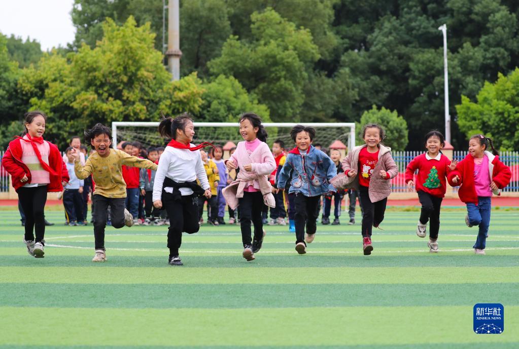 11月4日,在湖南省永州市新田縣雙碧小學,孩子們在運動場上做游戲。今年秋季學期開學以來,各地積極落實「雙減」政策,利用課後服務時間開展內容豐富、形式多樣的課外活動,促進學生全面發展。(新華社發 劉貴雄攝)