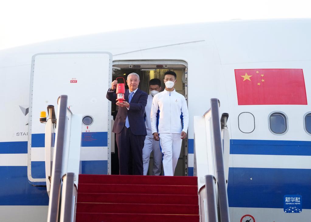 10月20日,在北京首都機場,北京冬奧組委特別代表、北京冬奧組委副主席於再清(左)手持火種燈走出艙門。隨着北京冬奧組委赴希臘代表團抵達首都機場,北京冬奧會火種順利抵達北京。(新華社記者 張晨霖 攝)