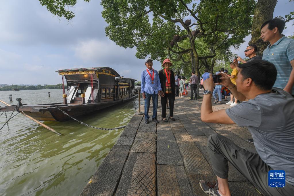 兩名老黨員在浙江嘉興南湖湖心島停泊的南湖紅船旁拍照留影(7月1日攝)。(新華社記者 徐昱 攝)