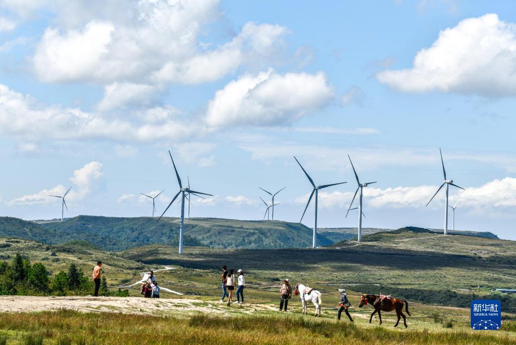 游客在貴州省龍裏縣龍裏大草原的風電場觀光(9月21日攝)。(新華社記者 楊文斌 攝)