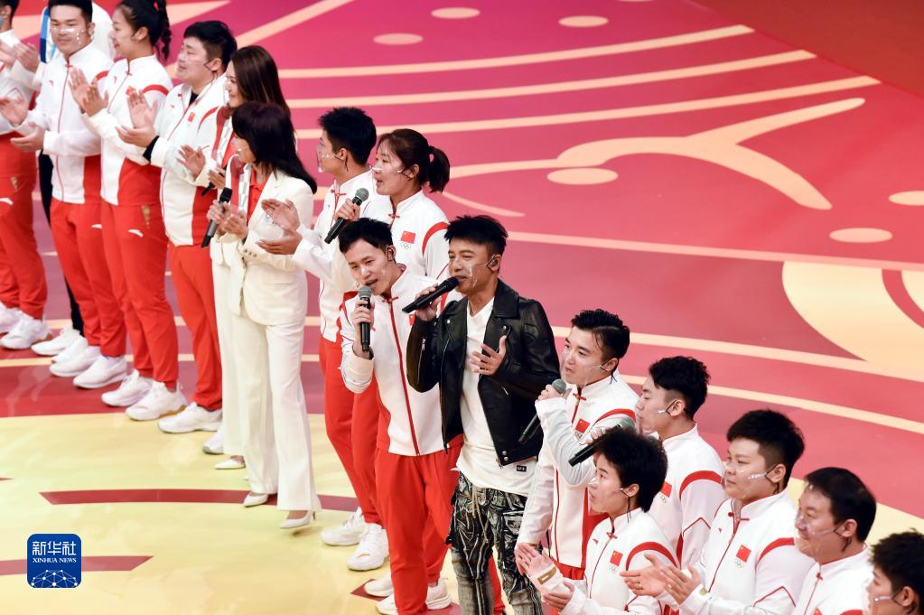 內地奧運健兒代表團成員許昕(前右)在現場演唱。(新華社記者 盧炳輝 攝)