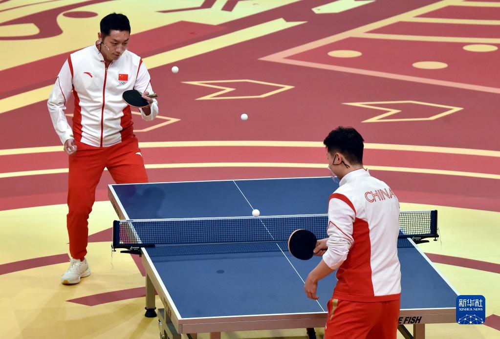 內地奧運健兒代表團成員許昕(左)、馬龍在現場表演同時打三個乒乓球游戲。(新華社記者 盧炳輝 攝)
