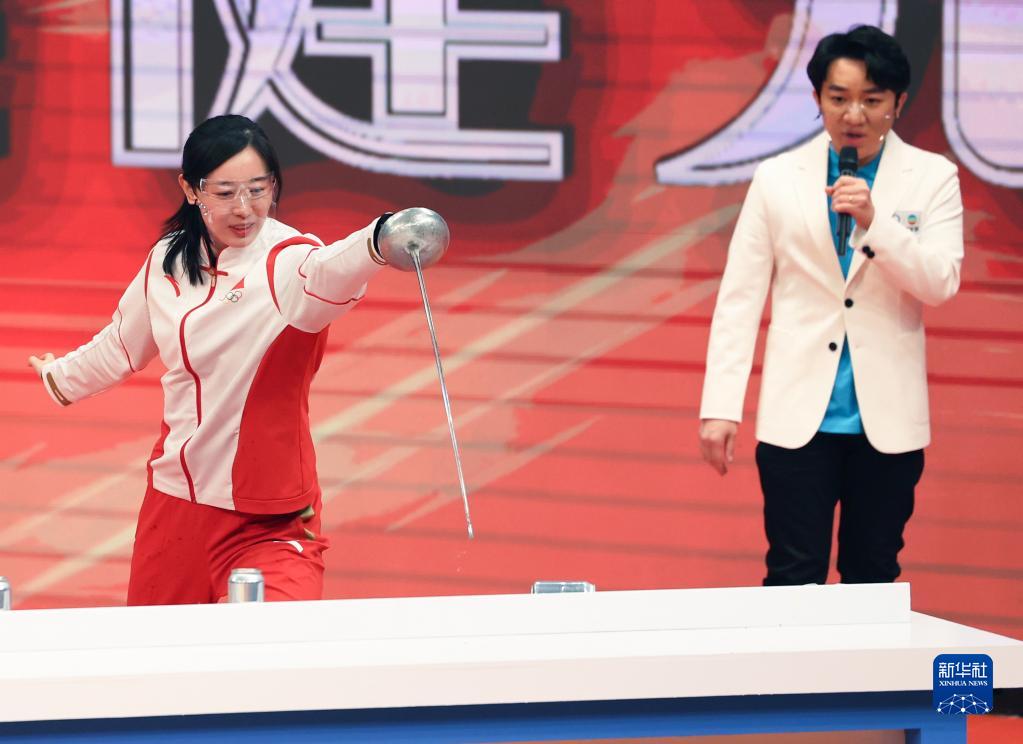 匯演為奧運健兒們設置了多個小游戲,對女子重劍奧運冠軍孫一文的考驗是「劍刺易拉罐」。面對挑戰,孫一文笑着説「這也太簡單了吧」。果然,「唰、唰、唰」,隨着幾道寒光,五個易拉罐應聲倒下。