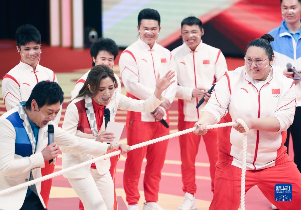 內地奧運健兒代表團成員李雯雯(右二)在匯演中與主持人互動。(新華社記者 賈浩成 攝)