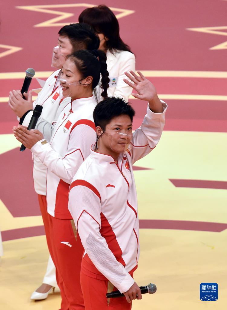 內地奧運健兒代表團成員蘇炳添(右一)向觀眾揮手致意。(新華社記者 盧炳輝 攝)