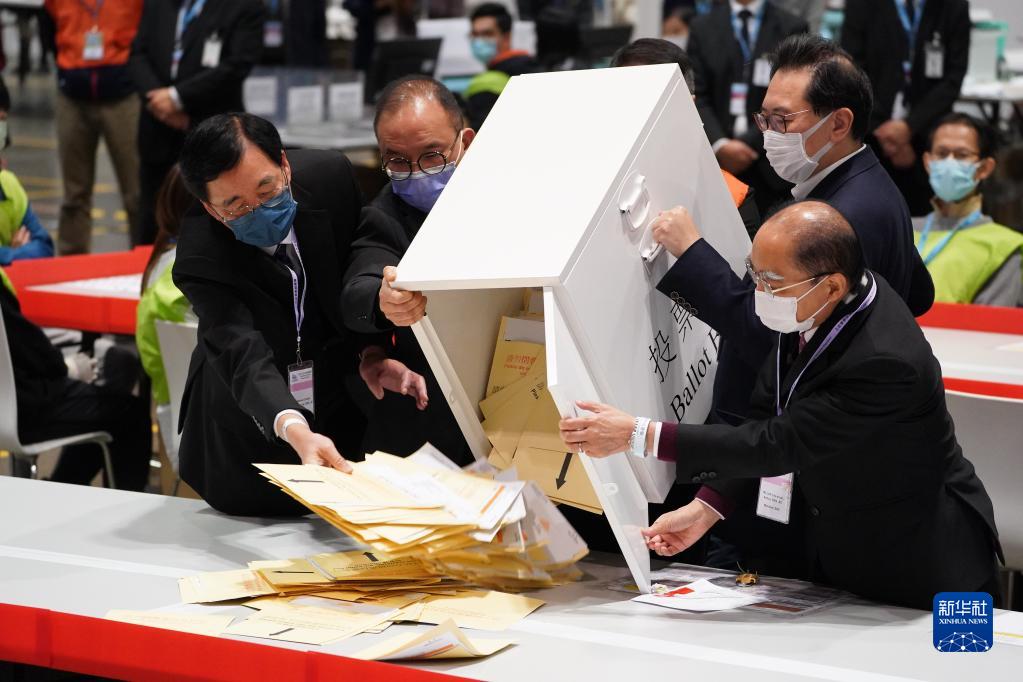 12月19日,香港特區選舉管理委員會主席馮驊(右二)打開票箱。(新華社記者 呂小煒 攝)
