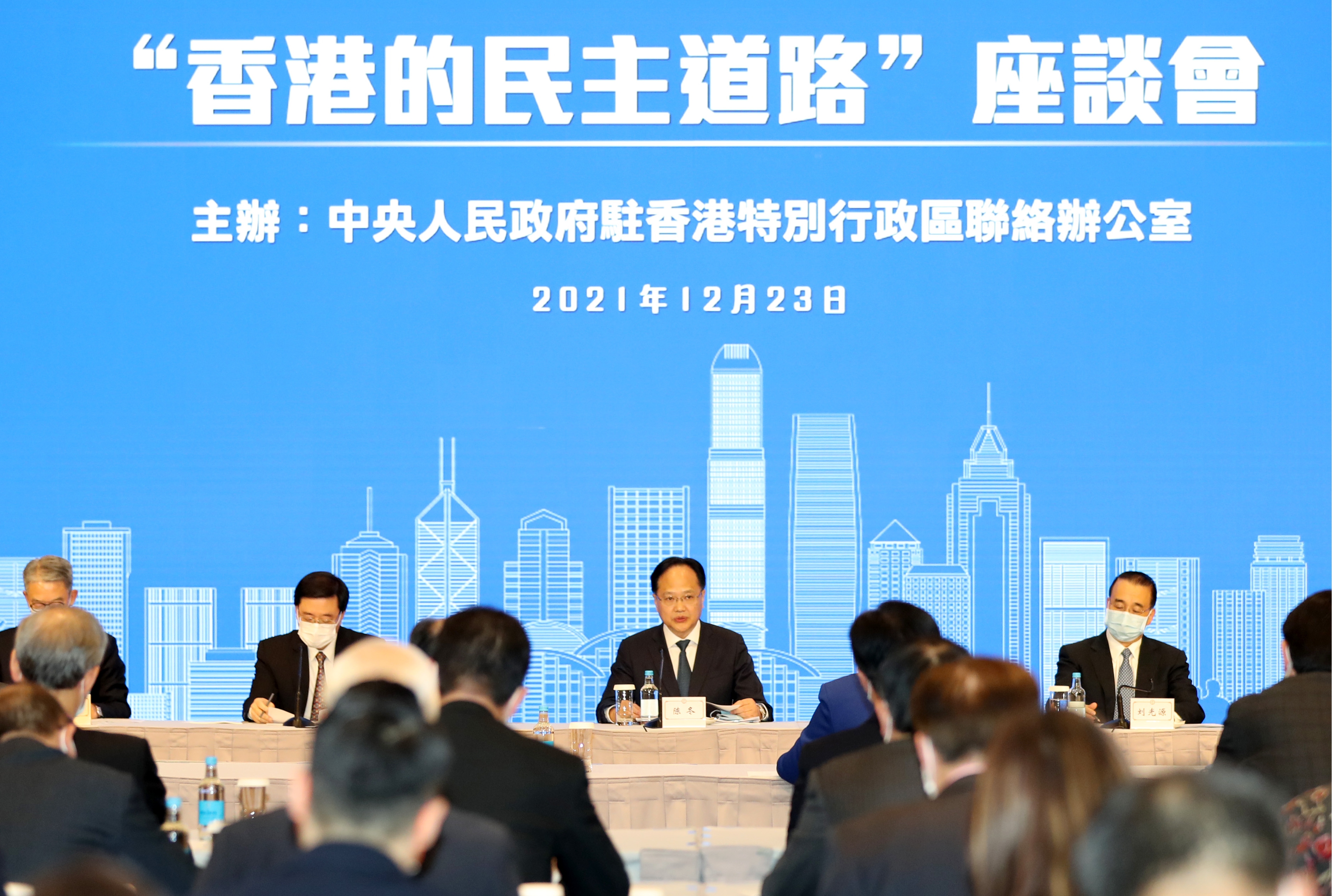 本網訊 12月23日,中央政府駐港聯絡辦在港舉辦「香港的民主道路」座談會。我辦副主任陳冬在座談會上作主旨發言,特區政府政務司司長李家超、外交部駐港特派員公署特派員劉光源出席並發言。座談會由我辦副主任譚鐵牛主持,我辦副主任羅永綱、何靖、尹宗華和秘書長王松苗,中央政府駐港國安公署副署長孫青野,解放軍駐港部隊副政治委員王兆兵,特區政府律政司司長鄭若驊等出席。