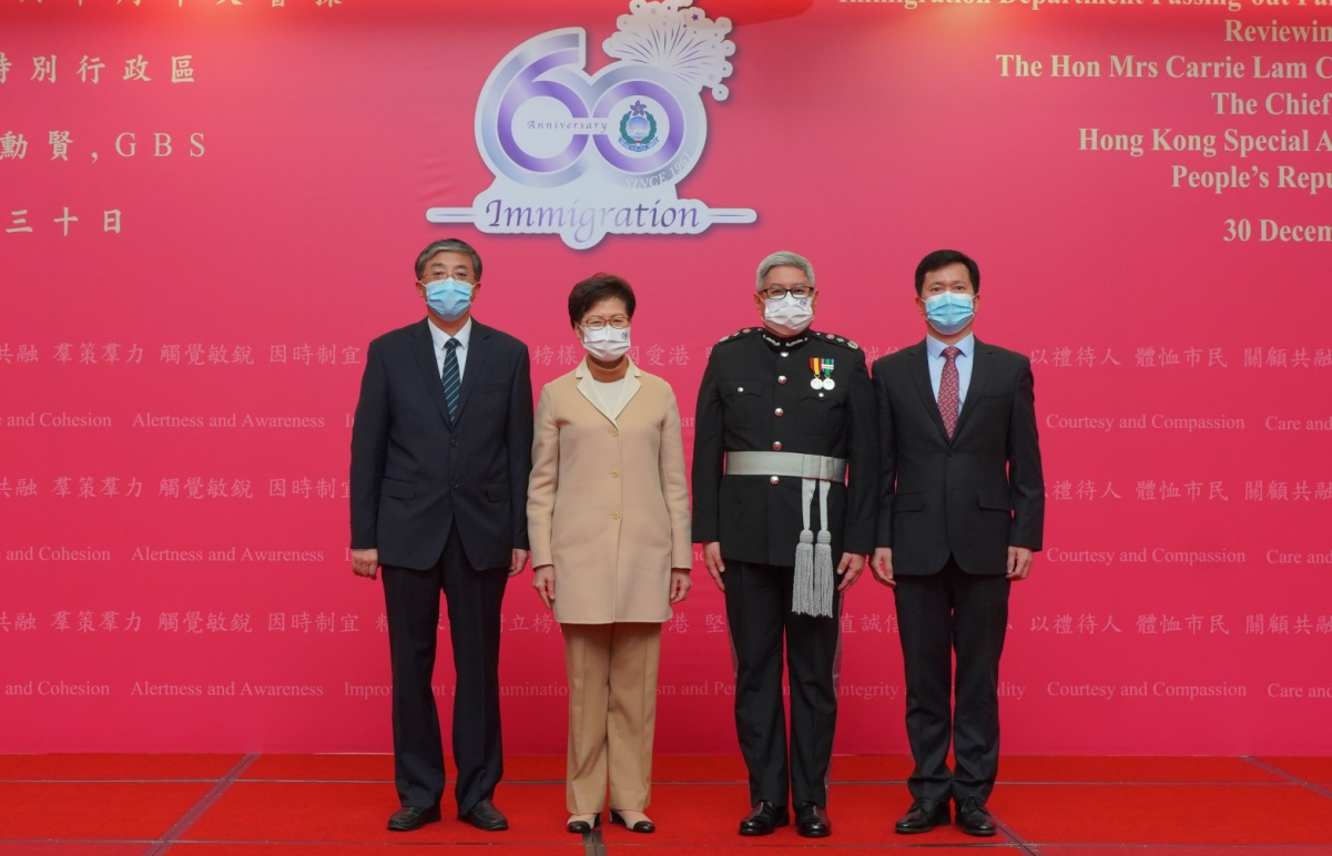 本網訊 12月30日,香港入境事務處在入境事務學院舉行學員結業暨六十周年大會操。香港特區行政長官林鄭月娥檢閱會操並致辭,香港中聯辦副主任羅永綱出席活動並觀禮。