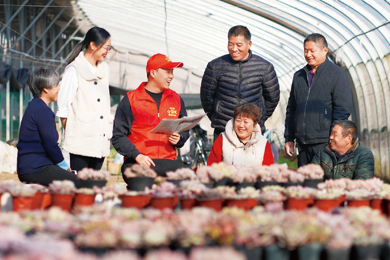 河北省邢台市內丘縣組織六十二支「小馬扎」宣講小分隊深入到社區、學校、農村和企業,利用快板、詩歌、説唱等群眾喜聞樂見的形式開展宣講活動,把黨的十九屆六中全會精神送到群眾家門口。圖為2021年11月23日,「小馬扎」宣講小分隊隊員在馬澗村花卉大棚宣講全會精神。(人民圖片 劉繼東 攝)
