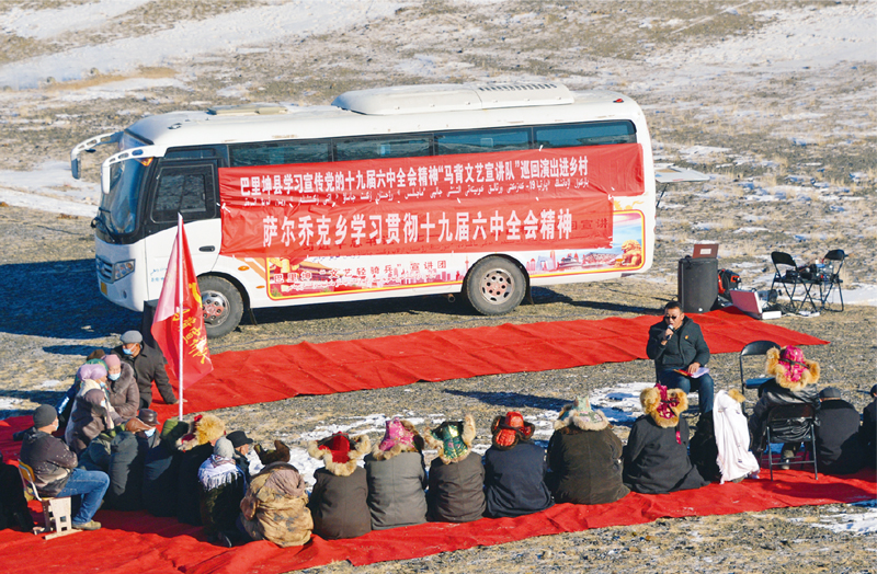 新疆巴裏坤哈薩克自治縣組建「馬背文藝宣講隊」,深入邊遠農牧區鄉村開展黨的十九屆六中全會精神巡迴宣講。圖為2021年12月1日,宣講隊給冬牧場的哈薩克族牧民宣講全會精神。(人民圖片 張建剛 攝)