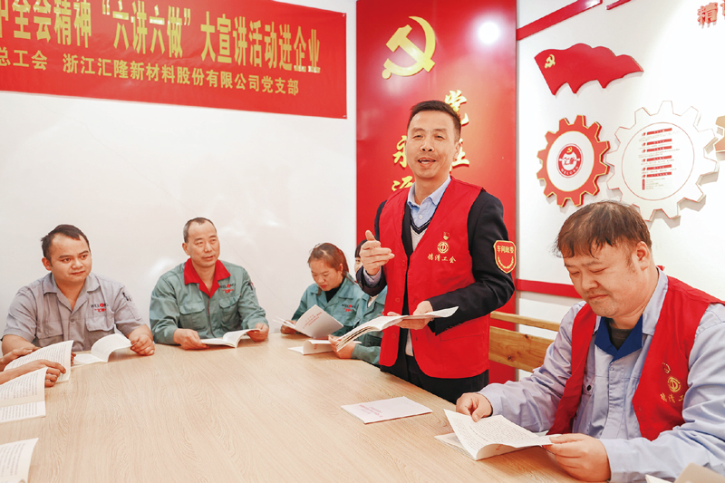 浙江省湖州市德清縣總工會組織由車間政委、勞動模範、浙江工匠等組成的「典型模範宣講團」走進企業宣講黨的十九屆六中全會精神。圖為2021年11月30日,宣講團成員在浙江匯隆新材料股份有限公司的紅色車間為職工宣講全會精神。(人民圖片 姚海翔 攝)