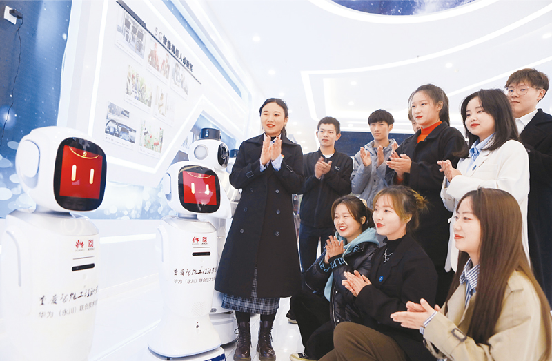2021年11月13日,重慶智能工程職業學院校園內,智能機器人「大華」、「大智」向學生們普及黨的十九屆六中全會精神,其可愛的形象和聲音,深受學生們的喜愛。(人民圖片 陳仕川 攝)