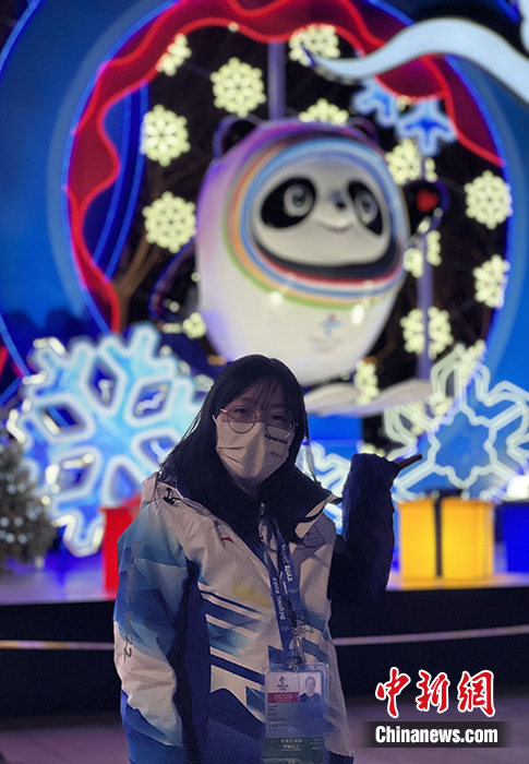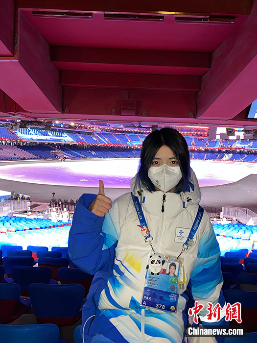 中央美術學院的香港學生林曉雯今年作為北京冬奧會志願者,首次在京過年。圖為她近日在「鳥巢」參加北京冬奧會開幕式的志願者服務。(中新社發 受訪者供圖)