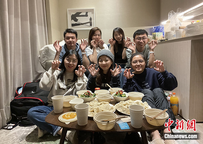 北京語言大學的澳門學生蘇嘉怡今年作為北京冬奧會志願者,首次在京過年。圖為蘇嘉怡(前排左一)除夕與部分志願者一起吃年夜飯。(中新社發 受訪者供圖)